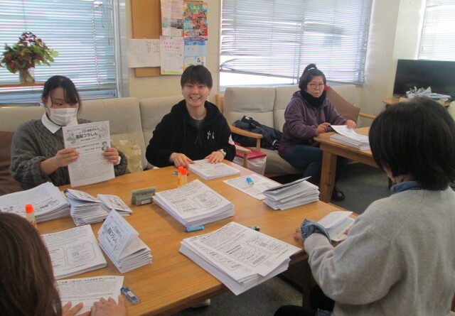 折るのが好きな人、それを封筒に入れるのが好きな人、ふうとうのノリ付けが好きな人、と、それぞれてわけしてみんなで完成させます。