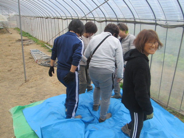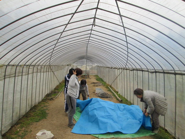 着いてみると、ビニールハウス内にブルーシートが敷いてあります。