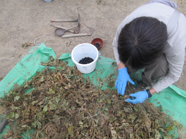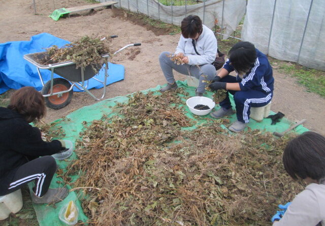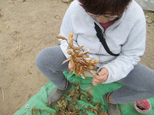 仲間と一緒にわいわいと黒豆の収穫を始めました。