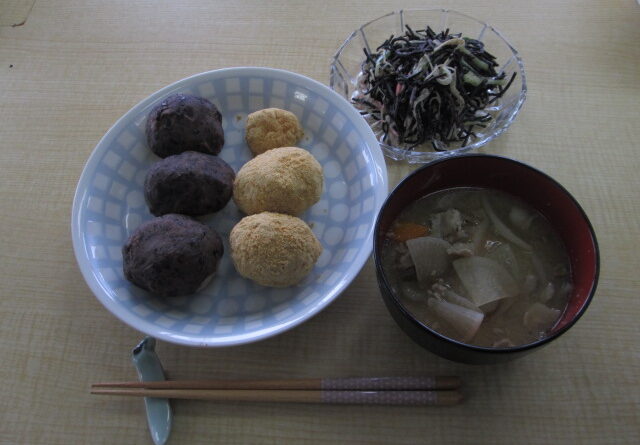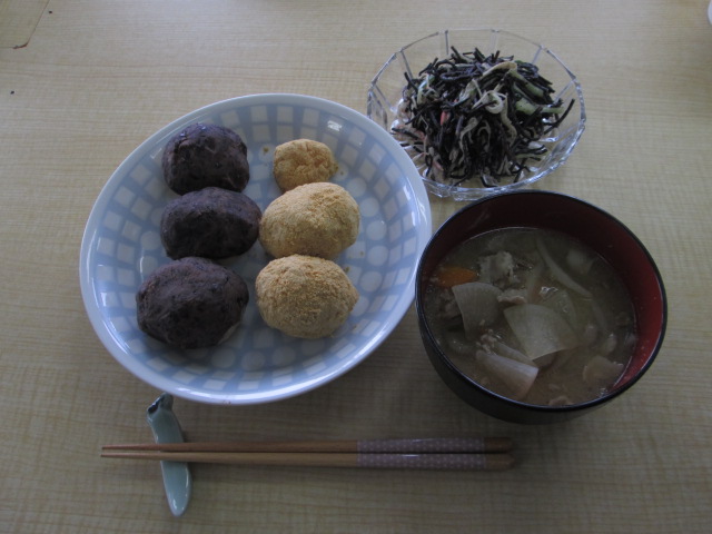 今日は楽しく、おはぎ、豚汁、ひじきサラダが出来ました。
